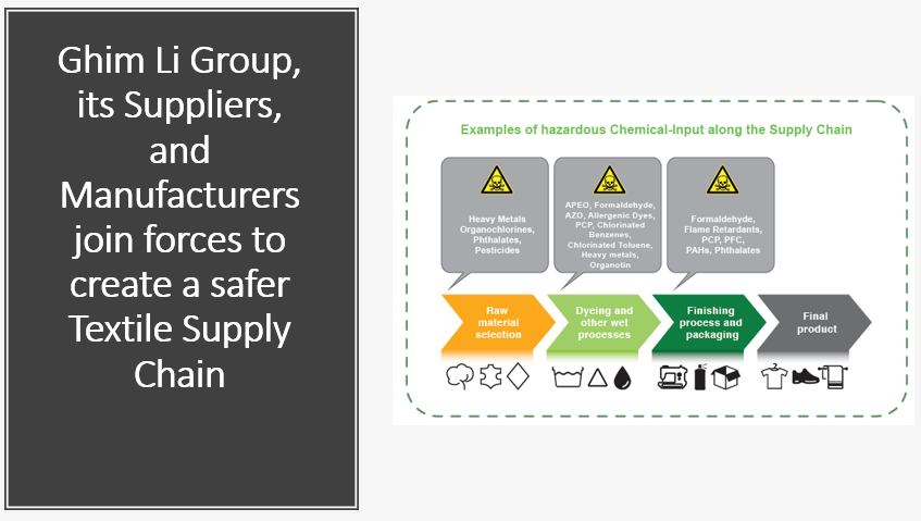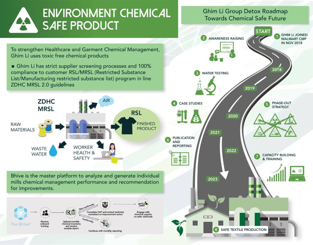 Ghim Li Group has launched the DETOX Program partnering with Walmart in Dec 2018, which focuses on developing and implementing a roadmap to avoid hazardous chemicals in the textile supply chain.
